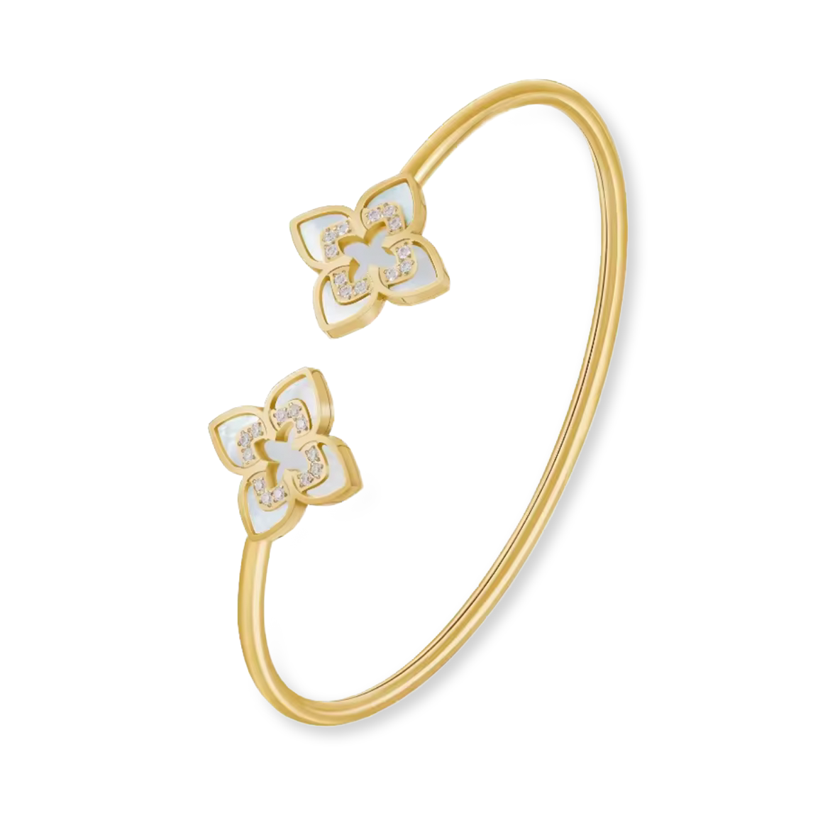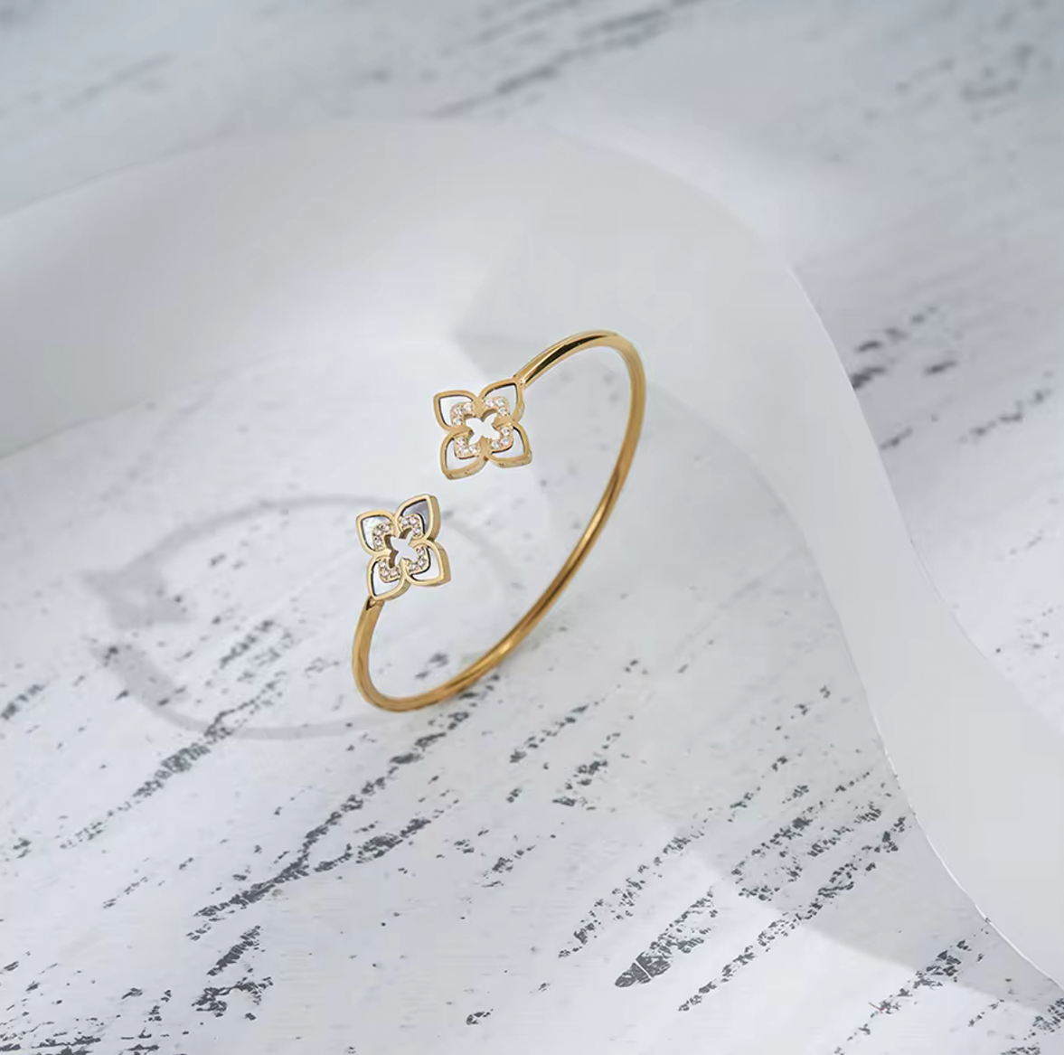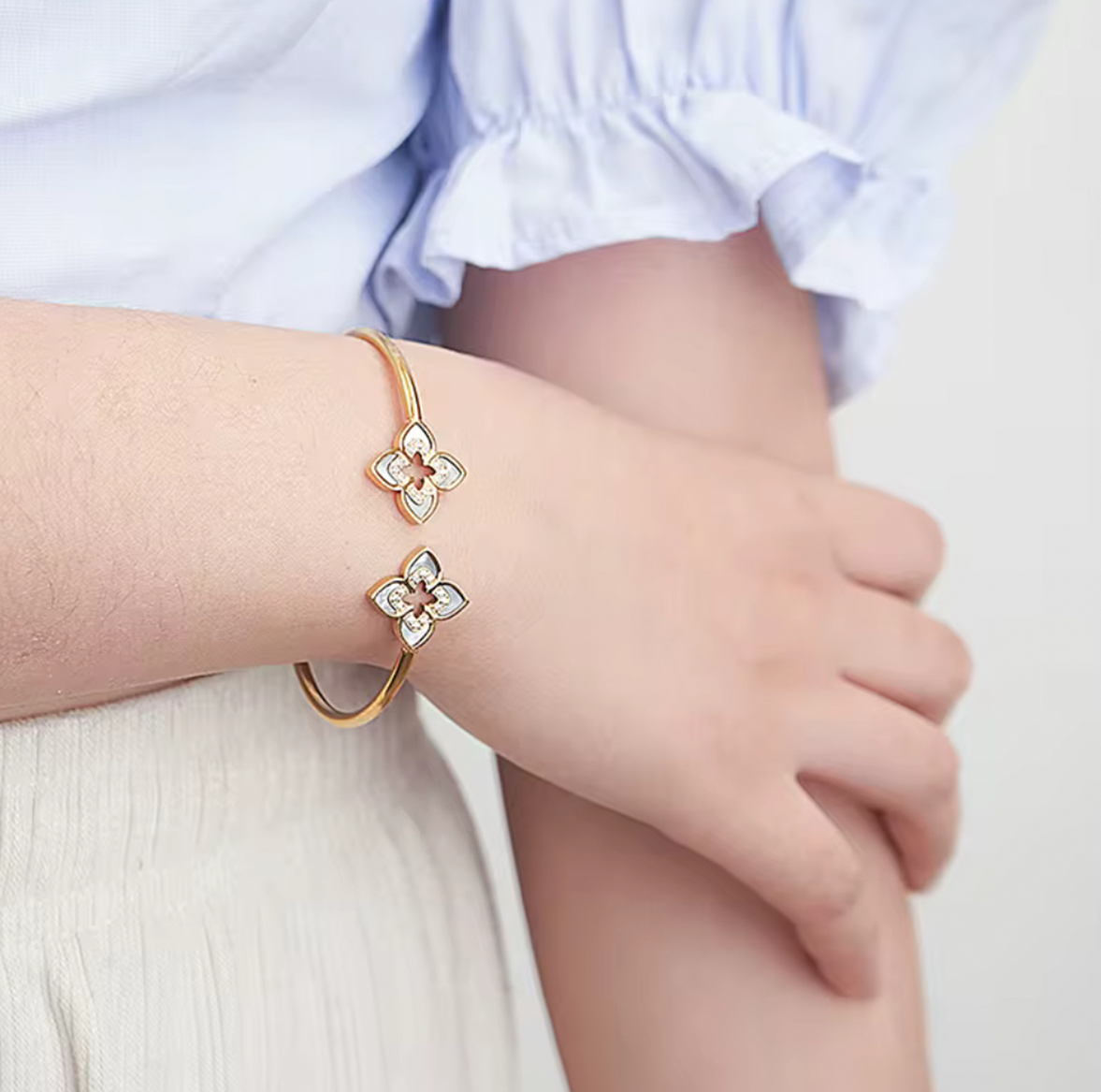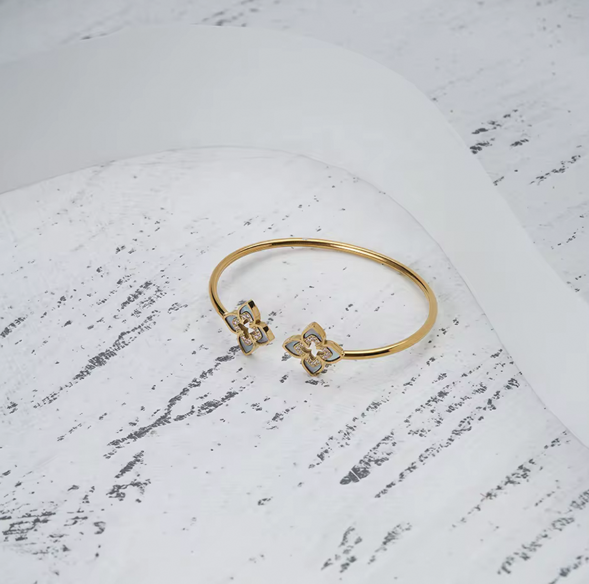 Add timeless elegance to any look with the Azura Bracelet. Featuring a chic four-point clover design with stone accents, this versatile piece is crafted from 18K gold-plated stainless steel for lasting shine. Water and tarnish-resistant, hypoallergenic, and perfect for everyday wear or special occasions.