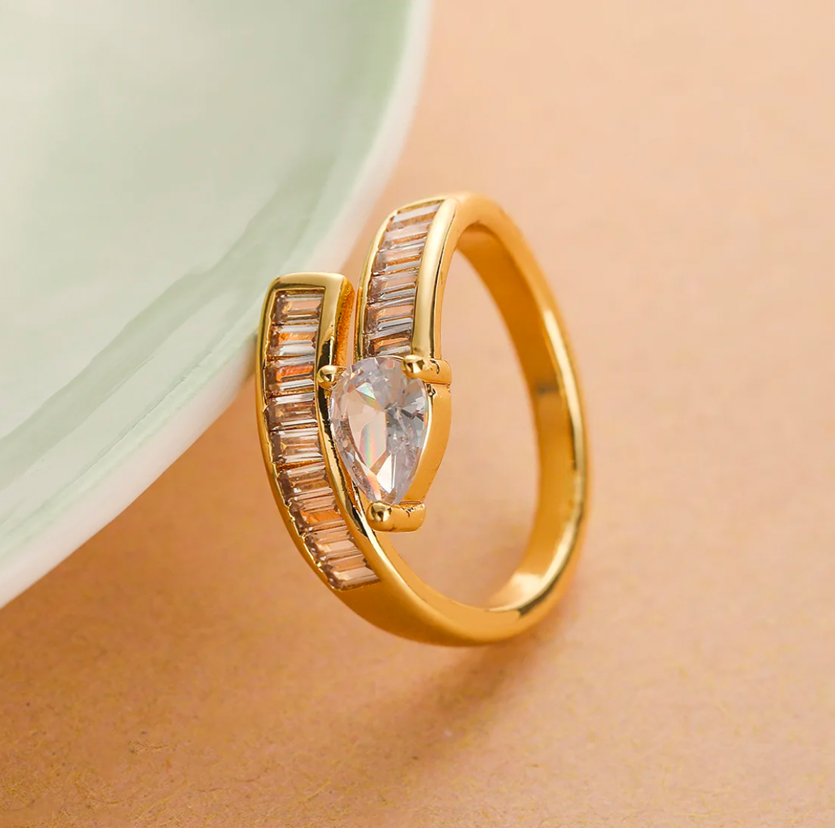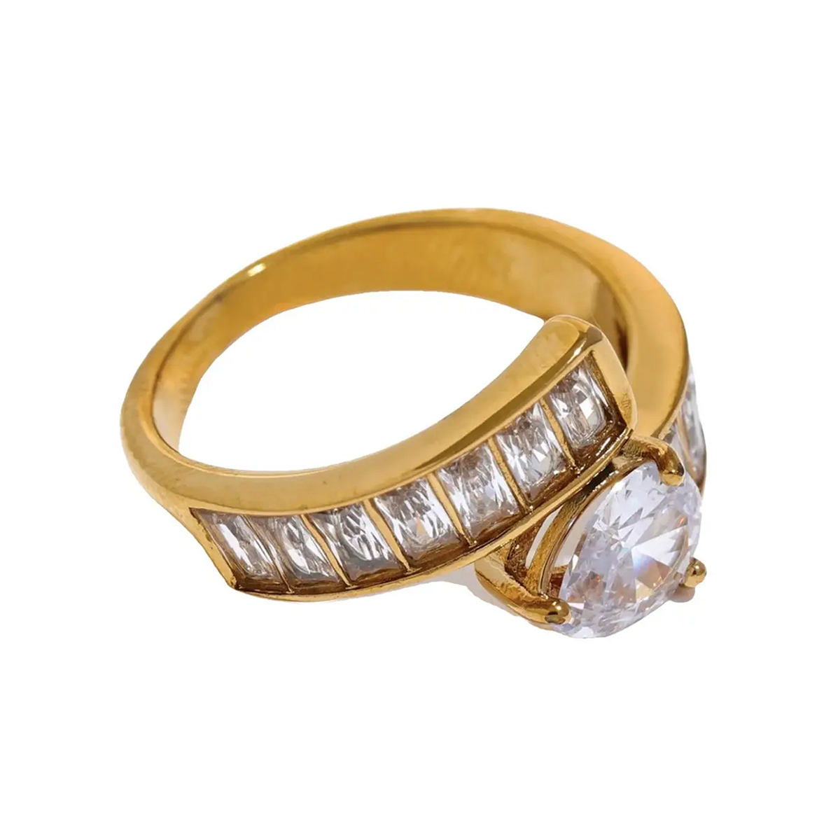 A high-quality stainless steel ring, plated with 18k Gold, featuring a white main stone. Waterproof, hypoallergenic, and resizable.
